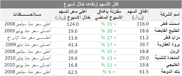 أما بالنسبة للشركات الكبرى فسجلت هي الأخرى ارتفاعات متفاوتة حيث تقدمها البنوك القطرية بقيادة قطر الوطني المملوك للحكومة، كما يوضح الجدول التالي: